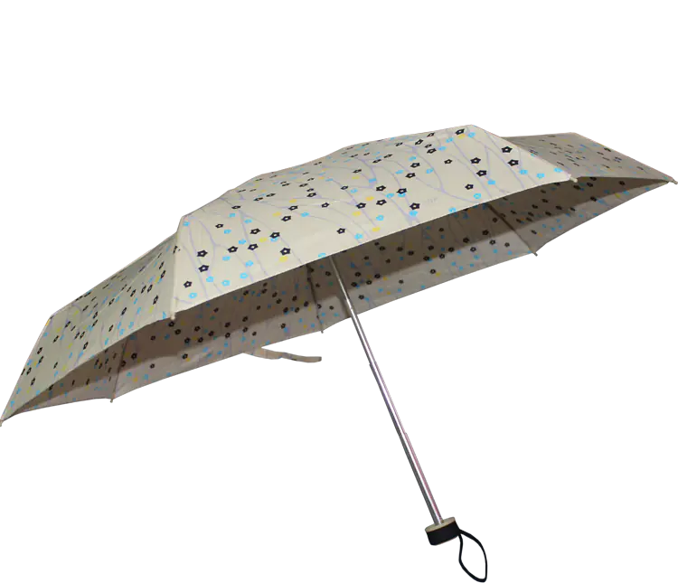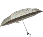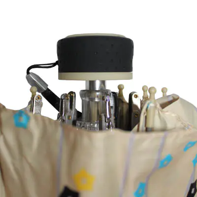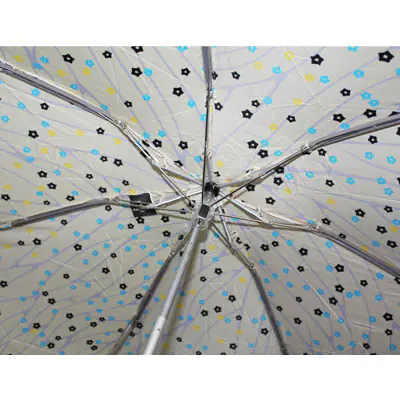 Guarda-chuva anti-vento de mulher, punho redondo, 52cms de comprimento, 7 varetas, haste de 5 secções, cobertura com estampado de desenho de padrão negro e bege. Produto internacional da Cacharel.