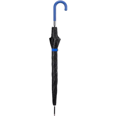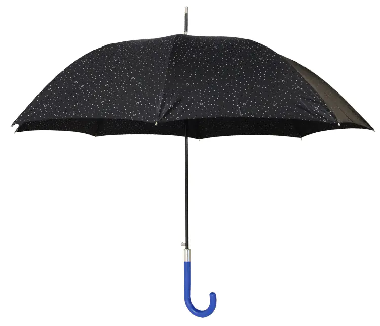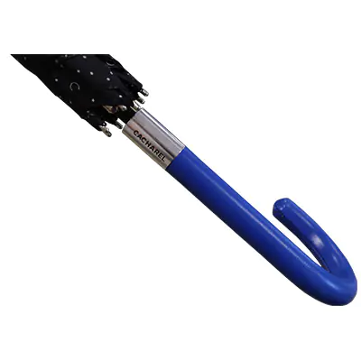 Guarda-chuva automático de mulher, cabo curvo azul, 61cms de comprimento, 8 varetas, 10mms haste, cobertura preta com pontos brancos. Produto internacional da Cacharel.