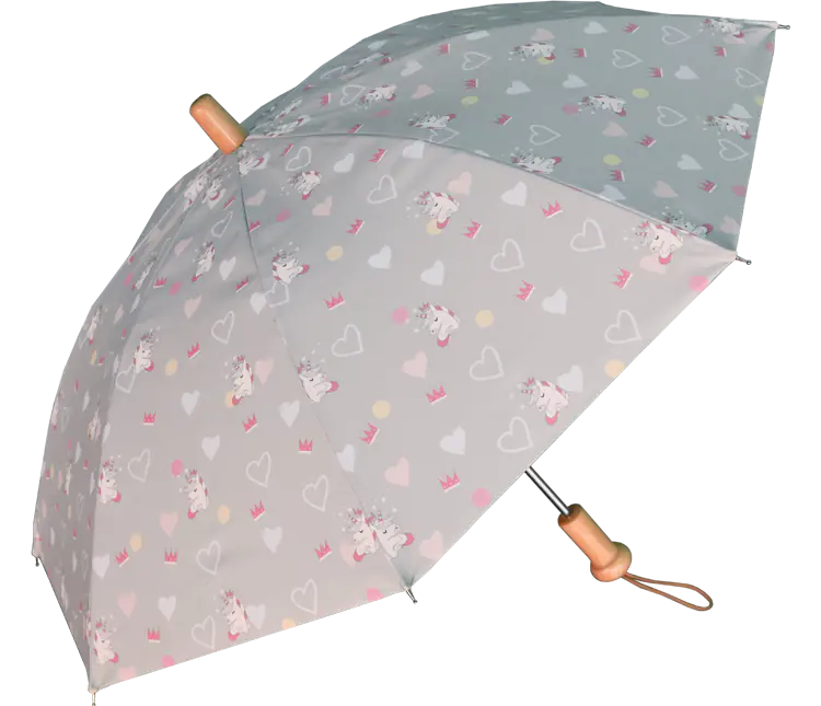 Guarda-chuva manual de criança, cabo de madeira, 48cms de comprimento, 8 varetas, 8mms haste, cobertura com padrão de unicórnio.