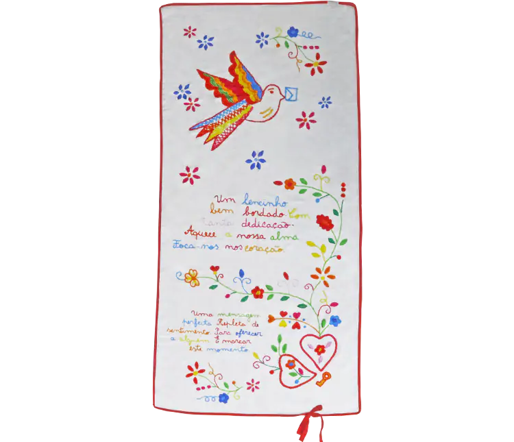 A Loja DosPereiras junta as toalhas de praia à sua coleção de produtos de verão. 100 % produzidas em Portugal, as nossas toalhas acrescentam um toque de cor aos dias mais quentes. Este acessório será o seu fiel companheiro para os dias de sol e praia e fará com que se destaque das multidões.Este produto é uma celebração do amor e da tradição portuguesa, inspirados nos icónicos Lenços dos Namorados. Cada peça é criada com detalhes delicados, cores vibrantes e mensagens que resgatam a arte ancestral do bordado, mantendo viva a essência romântica e artesanal deste símbolo cultural. Nesta coleção especial, encontra artigos únicos que combinam história, design e emoção, perfeitos para oferecer ou para trazer um pouco mais de Portugal para o seu dia a dia. Seja em acessórios, decoração ou peças exclusivas, cada produto conta uma história bordada com carinho. Toalha em algodão/polyester com 198cm de altura e 94cm de largura.
